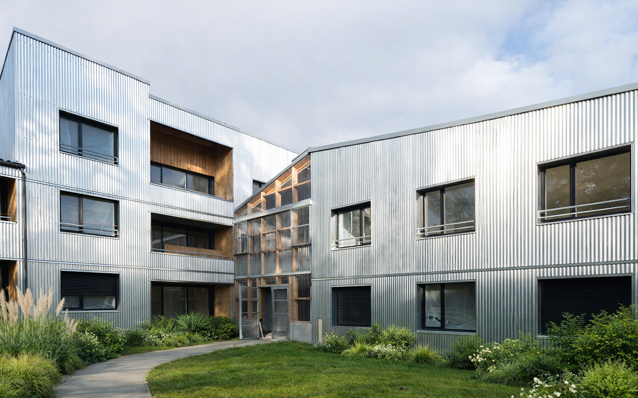 Les logements, conçus lors d’ateliers participatifs, bénéficient tous d’une double orientation et d’espaces extérieurs privés, jardinet, balcon ou loggias. La structure est mixte bois béton, avec un mur d’enveloppe en MOB remplissage ouate de cellulose. Les façades et planchers des «serres» sont entièrement en bois et offrent une qualité d’atmosphère à ces grands paliers appropriables.
