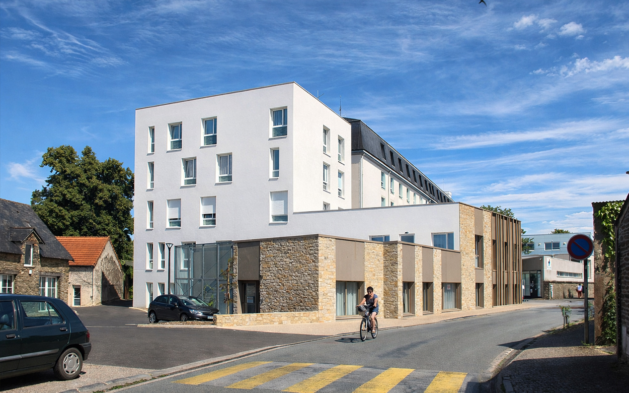 Le bâtiment d’origine de la Clinique des Augustines a un caractère architectural de qualité. Cependant, les extensions nécessaires à l’évolution de l’activité ont créé au fil du temps une complexité que nous souhaitons apaiser par cette nouvelle construction. Nous proposons un bâtiment socle en alignement sur rue qui utilisera du béton matricé réinterprétant les murs de pierre du bâtiment de l’accueil et des maisons avoisinantes. Un système de brise-soleil fixe permettra d’apporter l’intimité nécessaire au programme. En partie supérieure, le projet se cale sur le bâtiment existant aussi bien dans sa volumétrie que dans son traitement blanc. La liaison passerelle entre l’extension et le bâtiment existant est contemporaine. Nous avons souhaité conserver le même accès direct à la tombe de Mère Yvonne Aimée de Malestroit et pour cela, nous avons reprofilé le terrain devant le projet pour permettre un passage sous la passerelle de liaison. La nouvelle topographie du parvis d’accueil nous donne un accès de plain-pied à l’hôpital de jour et bien sûr à l’accueil actuel.