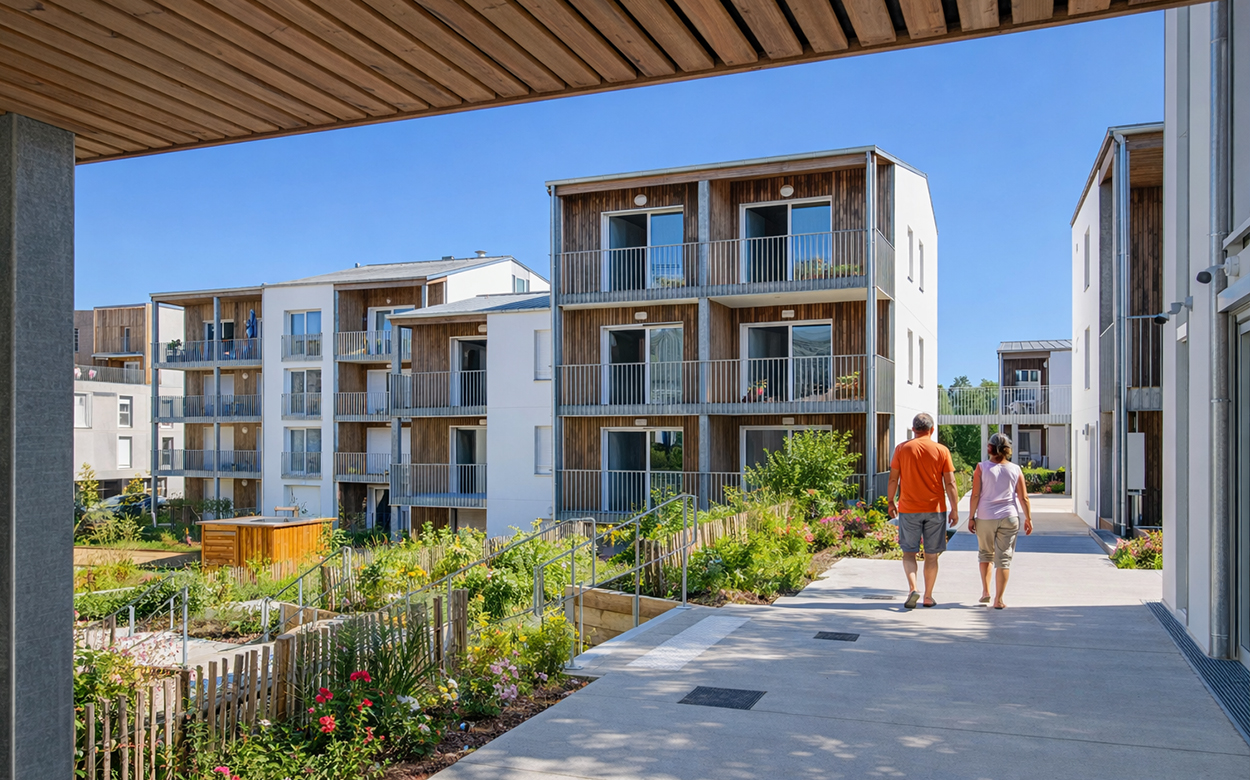 Notre projet s’installe tout naturellement dans la pente du terrain. Les gabarits des petits collectifs ou des logements intermédiaires sont progressifs d’Est en Ouest du R+1 au R+3 avec deux niveaux d’accès.