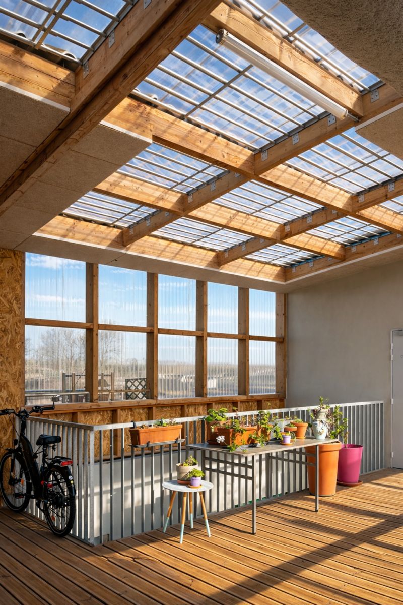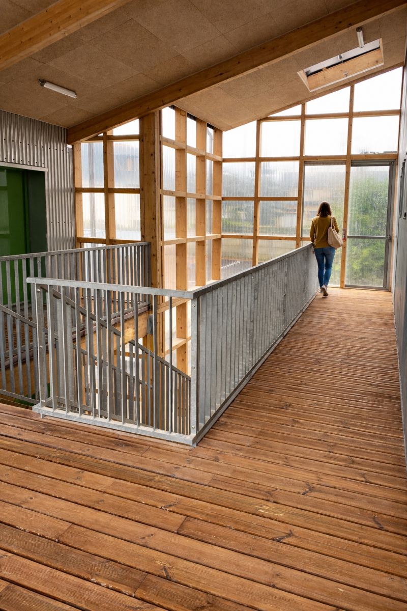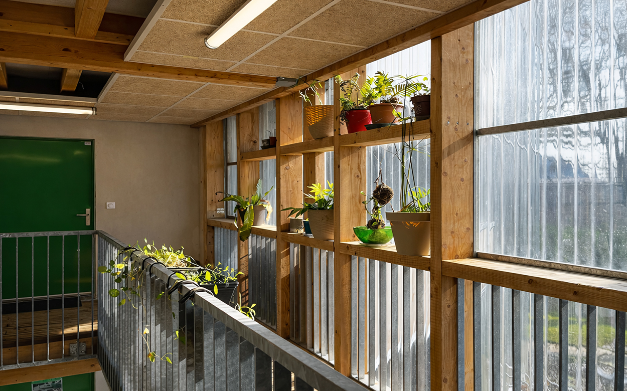 Les logements, conçus lors d’ateliers participatifs, bénéficient tous d’une double orientation et d’espaces extérieurs privés, jardinet, balcon ou loggias. La structure est mixte bois béton, avec un mur d’enveloppe en MOB remplissage ouate de cellulose. Les façades et planchers des «serres» sont entièrement en bois et offrent une qualité d’atmosphère à ces grands paliers appropriables.
