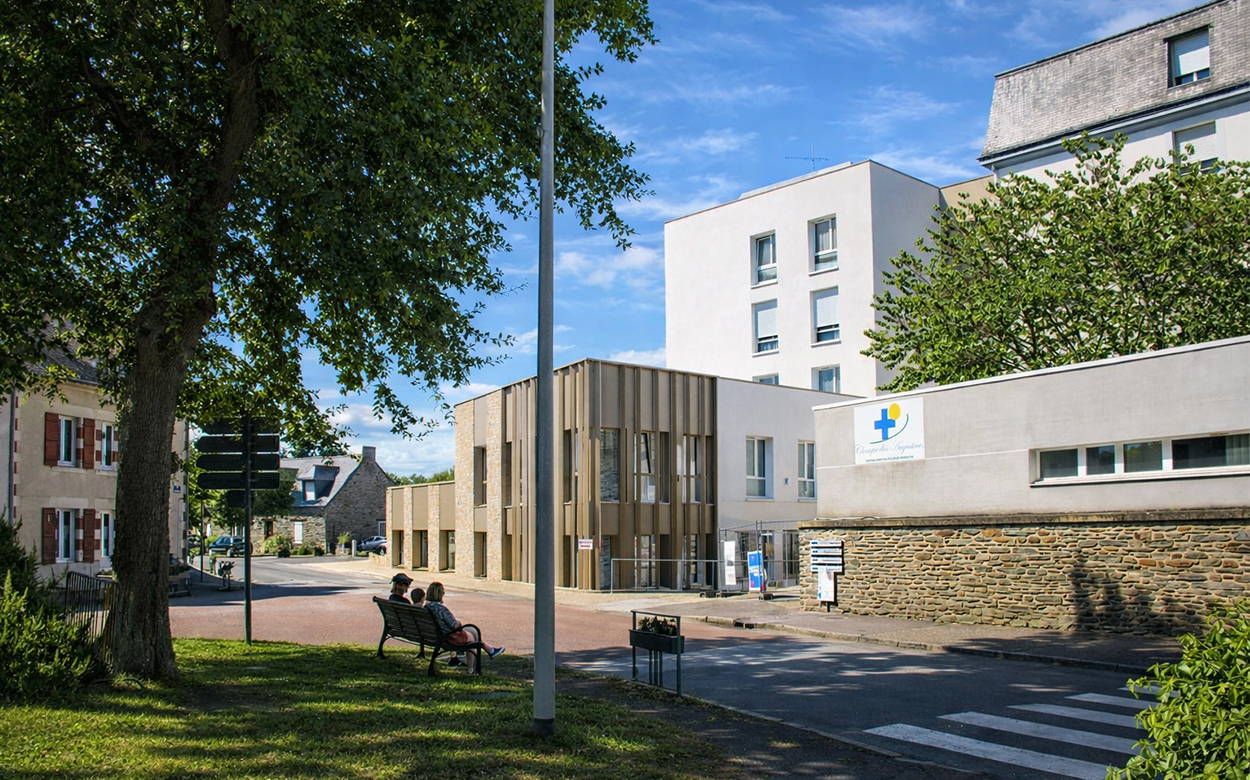 Le bâtiment d’origine de la Clinique des Augustines a un caractère architectural de qualité. Cependant, les extensions nécessaires à l’évolution de l’activité ont créé au fil du temps une complexité que nous souhaitons apaiser par cette nouvelle construction. Nous proposons un bâtiment socle en alignement sur rue qui utilisera du béton matricé réinterprétant les murs de pierre du bâtiment de l’accueil et des maisons avoisinantes. Un système de brise-soleil fixe permettra d’apporter l’intimité nécessaire au programme. En partie supérieure, le projet se cale sur le bâtiment existant aussi bien dans sa volumétrie que dans son traitement blanc. La liaison passerelle entre l’extension et le bâtiment existant est contemporaine. Nous avons souhaité conserver le même accès direct à la tombe de Mère Yvonne Aimée de Malestroit et pour cela, nous avons reprofilé le terrain devant le projet pour permettre un passage sous la passerelle de liaison. La nouvelle topographie du parvis d’accueil nous donne un accès de plain-pied à l’hôpital de jour et bien sûr à l’accueil actuel.